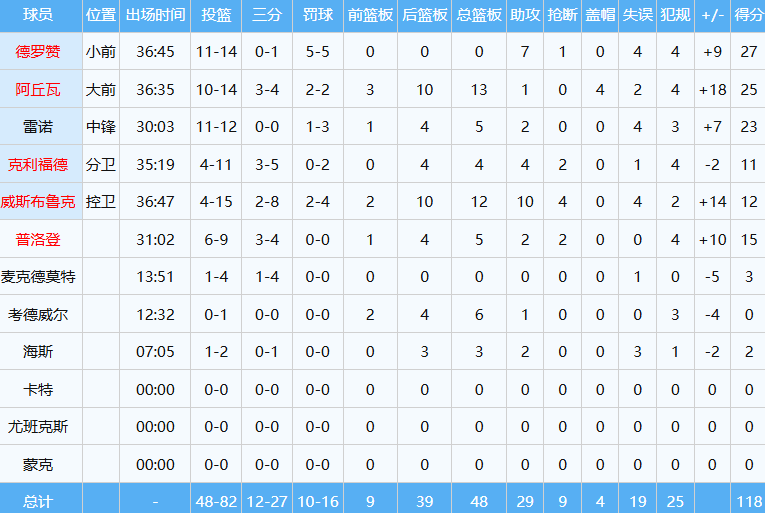最终西部垫底的国王,在客场118-109爆冷击败快船,此役德罗赞进攻极其高效,投篮14中11,以约78.6%命中率贡献27分外加7助;威少面对老东家,12分12板10助三双到手并且送出4次抢断。